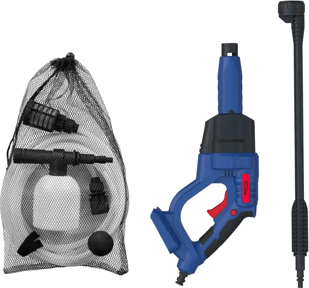 DR 18-0 magasnyomású mosó, tisztítószeres flakon, nyomótömlő, multifunkciós fúvóka, táska, adapter PET palackokhoz, akkumulátor és töltő nélkül