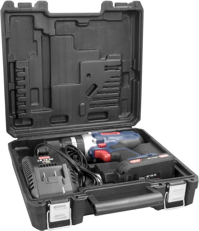 1 x ütvefúró, 1 x gyorstöltő (3,0 A), 1 x 18 V-os lítium-ion akkumulátor (2,0 A), 1 x tok fémcsatokkal és 13 darabos fúró- és bitkészlet (6 x HSS fúrószár - Ø 2,0 - 6,0 mm | 6 x CR-V bit - SL5, SL6, PH1, PH2, PZ1, PZ2 | 1 x bit tartó - 55 mm mágneses).