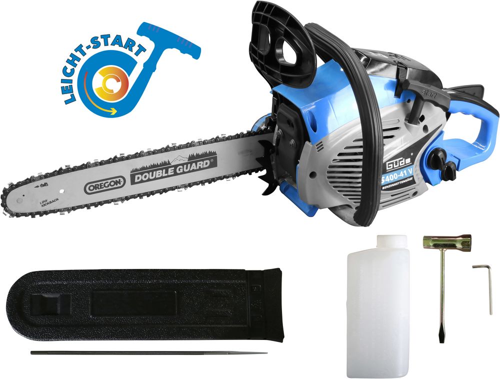 | • | #94885 Csere-kard A Güde benzines láncfűrész KS 400-41 V 1,9 lóerővel, kiváló minőségű 400 mm-es OREGON vágókészlettel és erős 41 cm3-es kétütemű motorral a belépő szintű Güde láncfűrész. A 400-41 V ideális minden könnyű és közepes tűzifa munkához, és alkalmi, kisebb fakivágási munkákhoz is használható. A rugós hátrameneti indító, valamint a fojtószelep és a gyújtópumpa lehetővé teszi a könnyű és gyors indítást minden jelentős erőfeszítés nélkül, minden korú és nemű felhasználó számára. A 400-as emellett rendkívül hatékony rezgéscsillapító rendszerrel, szerszám nélküli gyors láncfeszítéssel, valamint szerszám nélküli hozzáféréssel rendelkezik a légszűrőhöz és a gyújtógyertyához. A KS 400-41 V természetesen megfelel az EURO-V szerinti aktuális kipufogógáz-kibocsátási határértékeknek, és a szigorú biztonsági előírásoknak megfelelően GS-tesztelt. Műszaki adatok